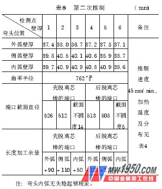 ( 5) 推制彎頭的檢測結果及分析 對推制彎頭用測厚儀檢測了外弧、側弧和內弧壁厚,用平臺劃線方式檢測了曲率半徑、端口截面直徑和長度加工余量。D508mm×36mm、R = 762mm、A = 50mm WB36彎頭的檢測結果如表7 、表8 所示。