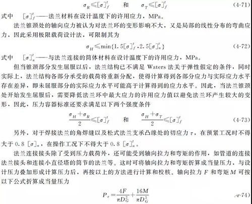 ② 整體法蘭 將法蘭與殼體鍛或鑄成一體或經全熔透的平焊法蘭,見圖4-25 (d)~(f)所示。這種結構能保證殼體與法蘭同時受力,使法蘭厚度可適當減薄,但會在殼體上產生較大應力。其中管路補償接頭的帶頸法蘭可以提高法蘭與殼體的連接剛度,適用于壓力、溫度較高的重要場合。