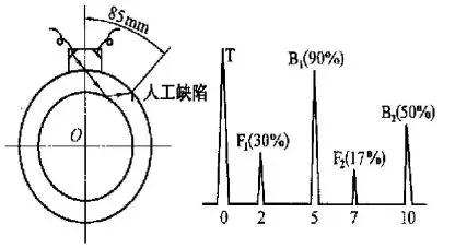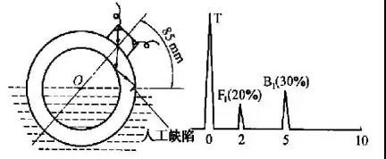 若樣管完全浸入水中檢測其內壁人工缺陷,一次通波B1和一次缺陷波F1較原始狀態分別衰減了12和6dB;二次通波B2和二次缺陷波F2完全消失。試驗過程這里不再贅述。當然這只是試驗,管路補償接頭在水浸法自動線探傷設備實際探傷中,鋼管內孔不允許充水,否則無法進行探傷。