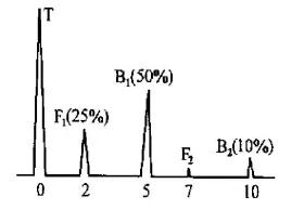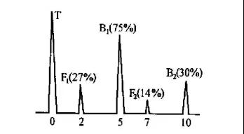 (2) 繼續加水至樣管直徑的1/2處,并保持探頭與人工缺陷相對位置不變,旋轉樣管使人工缺陷剛好浸入水中,此時波幅變化如圖5所示。可見,降至滿幅的30% (-9.5dB), F1降至滿幅的20% (-3.5dB);B2和F2同樣全部消失。管路補償接頭在水量增加,且人工缺陷也被水所浸的情況下,B1與F1較原始狀態下降幅度驟增,更加證明了水浸探傷時能量衰減嚴重。