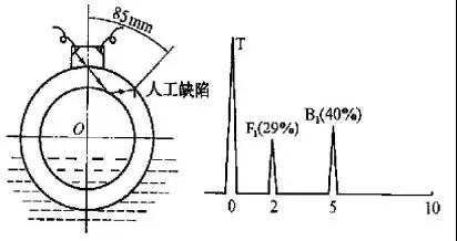管路補償接頭此狀態下,探頭中心線至人工缺陷的周向距離為85mm,衰減器讀數為38dB。我們將此狀態定為原始狀態,下面分三種情況進行試驗。