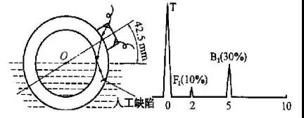 將探頭置于樣管上,找到人工缺陷,將一次通波B1調到5格,幅度為滿幅的90%,二次通波B2調到10格,管路補償接頭幅度為滿幅的50%;—次缺陷波F1在2格處,幅度為滿幅的30%,二次缺陷波F2在7格處,幅度為滿幅的17%(圖1)。