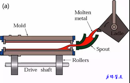 連續鑄造:是一種先進的鑄造方法,其原理是將熔融的金屬,不斷澆入一種叫做結晶器的特殊金屬型中,凝固(結殼)了的鑄件,連續不斷地從結晶器的另一端拉出,它可獲得任意長或特定的長度的鑄件。