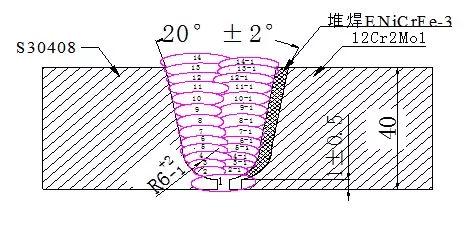 為了減少焊縫的稀釋,防止產(chǎn)生冷裂紋和再熱裂紋,12Cr2Mo1和S30408異種鋼焊接時(shí),在12Cr2Mo1側(cè)先堆焊鎳基焊材,選用熔合比小、稀釋率低的焊接方法,鎢極氬弧焊和焊條電弧焊的熔合比較小,焊縫成分也比較穩(wěn)定,因此,該異種鋼選用氬弧焊打底,焊條電弧焊蓋面的焊接方法。