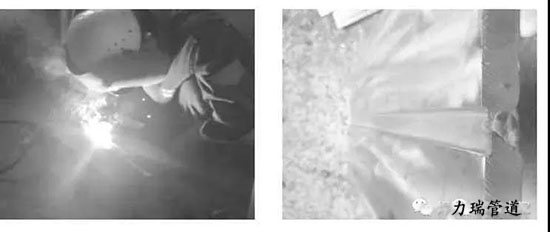 (6)通過工藝試驗,確定了基層的焊接工藝參數,見表5,現場施焊及焊縫成形如圖7所示。