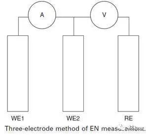如果 ECN 作為兩個相同工作電極之間的電流被測量,這種工作電極組合的電位可通過測量與另一參比電極或第三工作電極之間的電位而得到。這樣可以通過計算電位標準差和電流標準差的比值而得到電化學噪聲電阻 Rn,Eden 等人提出了面積與電位標準偏差的乘積與電流標準偏差的商得到的參數,該參數具有電阻乘以面積的單位,被稱為電化學噪聲電阻,這是測量電化學噪聲的簡單方法。