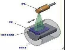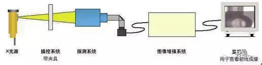 圖 2 為使用射線檢測的設備系統示意圖,射線經光源激發照射到工件檢測部位,探測系統探測到透射線強度,經圖像增強系統處理放大信號在監視器上顯現。圖 3 為工業上應用輻射顯示檢測管道內部質量情況的示意圖。