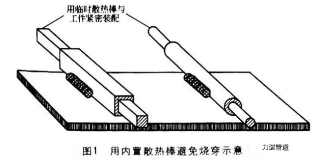 有,主要是在焊接過程中采用一個(gè)散熱棒。如將一個(gè)實(shí)心圓棒插入薄壁圓管中,或?qū)⒁粚?shí)心矩形棒插入矩形管件中,實(shí)心棒將會(huì)帶走薄壁工件的熱量并防止燒穿。一般來說,在多數(shù)供貨的中空管或矩形管材料中都緊密安裝了實(shí)心圓棒或矩形棒。焊接時(shí)應(yīng)注意將焊縫遠(yuǎn)離管子的末端,管子的末端是最易發(fā)生燒穿的薄弱區(qū)域。用內(nèi)置散熱棒避免燒穿的示意如圖1所示。