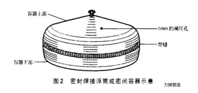 ③首先在浮筒上鉆一個(gè)直徑1.5mm的減壓孔,以利于焊縫附近的熱空氣與外部空氣流通,然后進(jìn)行封閉焊接,最后焊密封減壓孔。密封焊接浮筒或密閉容器的示意如圖2所示。當(dāng)焊接儲(chǔ)氣容器結(jié)構(gòu)時(shí),也可以采用減壓孔。應(yīng)注意的是,在密閉容器中進(jìn)行焊接是十分危險(xiǎn)的,焊前應(yīng)確保容器或管子內(nèi)部清潔,并避免有易燃易爆物品或氣體存在。
