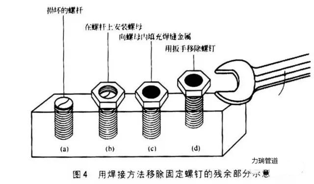 ② 如果螺釘槽、螺母或牙槽損壞或丟失,可以在螺釘頭的上部(或殘余部分)放置一個(gè)螺母,旋緊螺母,然后采用任何焊接方法在螺母和螺釘?shù)膬?nèi)部填充金屬。這樣就會(huì)將螺母和螺釘殘余部分連接起來,然后在螺母上放置扳手或牙鉗,迅速拔出螺釘。采用這種方法有利于提供一個(gè)新的握力點(diǎn)并可利用熱量使螺釘緊固,用焊接方法移除固定螺釘?shù)臍堄嗖糠质疽馊鐖D4所示。
