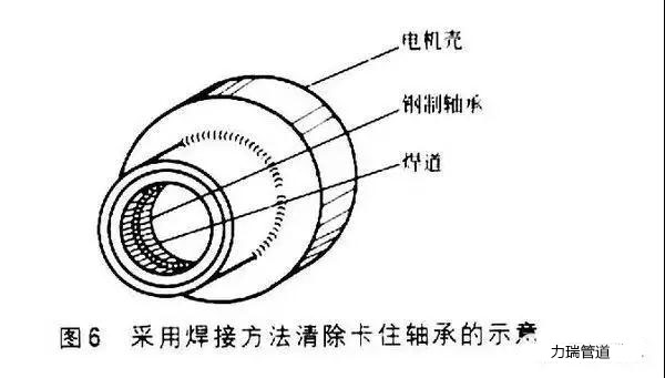 首先在軸承的內(nèi)表面焊接一條焊道,靠焊道拉伸力減小軸承直徑,外加焊接過程的熱量應(yīng)可使軸承活動(dòng)。直徑10cm的管如果在內(nèi)表面布滿焊道將會(huì)使鋼管直徑收縮1.2mm。采用焊接方法清除卡住軸承的示意如圖6所示。