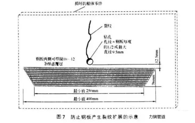 首先在裂紋末端鉆一個(gè)小孔,以利于在較大的范圍內(nèi)分散末端的應(yīng)力,然后焊接一系列長(zhǎng)度不等的多道焊縫,增加裂紋前端鋼板的強(qiáng)度。防止鋼板產(chǎn)生裂紋擴(kuò)展的示意見圖7。
