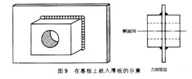 將一厚板金屬嵌入基板需要加厚的部位,然后采用焊接方法進(jìn)行固定。在基板上嵌入厚板的示意見圖9。這樣可以給后續(xù)的機(jī)械加工、鏜削加工或鉆孔提供足夠的厚度,并可以代替設(shè)備中的大厚度零件或鑄造件。