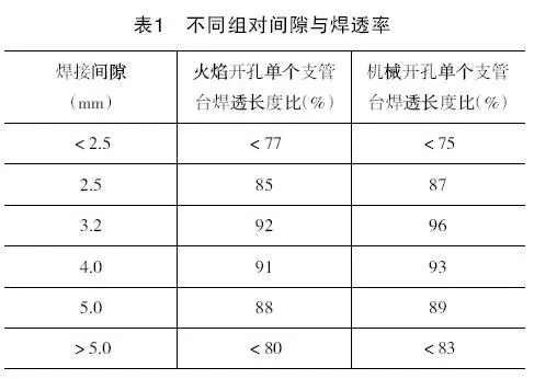 在保證合理的間隙下,機(jī)械開孔方式的單個(gè)支管臺(tái)焊透長度略大于火焰開孔,焊縫外觀質(zhì)量也優(yōu)于火焰開孔,這是因?yàn)椴捎脵C(jī)械開孔有利于保證組對(duì)間隙均勻,焊縫寬度差和余高差較低。