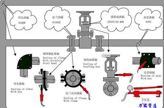 3、凝固法。利用壓入管道中某些物質(zhì)或利用介質(zhì)本身,從泄漏處漏出后,遇到空氣或某些物質(zhì)即能凝固而堵住泄漏的一種方法,稱為凝固法。某些熱介質(zhì)泄漏后析出晶體或成固體能起到堵漏的作用,同屬凝固法的范疇。這種方法適用于低壓介質(zhì)的泄漏。如適當(dāng)制作收集泄漏介質(zhì)的密封腔,效果會更好。