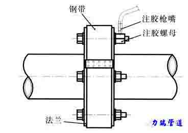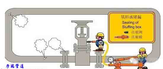 通常是采用相應(yīng)的盒式卡具,把泄露部位完全包封起來,然后往密閉腔注入密封劑消除泄露,注入密封劑方法與法蘭密封法相同,還可按適用溫度、壓力、介質(zhì)設(shè)計的密封環(huán)槽卡具,在槽中裝上石棉盤根,把此夾具裝在泄露部位上,再向環(huán)槽上的石棉盤根注密封劑及使盤根壓緊夾具的各連接點,而消除泄露。