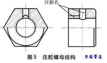 4、螺紋連接部位泄露的密封方法 隔熱管托將卡蘭卡在螺紋泄露部位的外表面,用頂絲頂緊,通過頂絲內(nèi)孔,用約直徑為3--4mm的長鉆頭鉆透陰螺紋壁,然后裝上注射槍注入少量密封劑,即能迅速消除泄露。