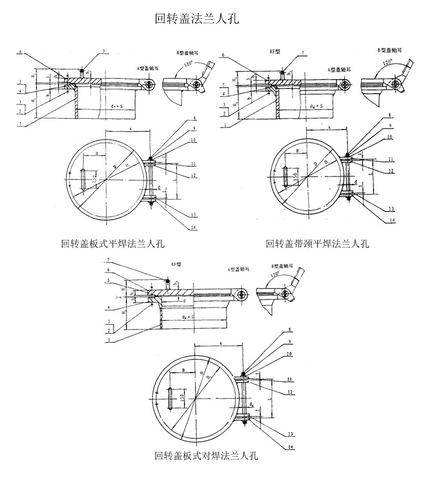 回轉(zhuǎn)蓋板式平焊法蘭人孔、回轉(zhuǎn)蓋帶頸平焊法蘭人孔、回轉(zhuǎn)蓋帶頸對焊法蘭人孔